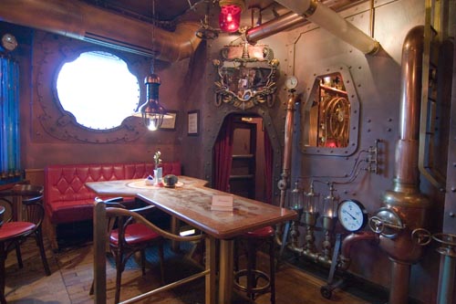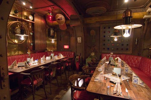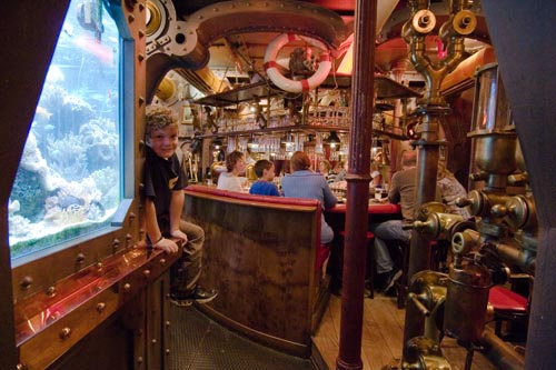 Ein großes Aquarium erinnert einen daran, dass man bereits auf Tauchfahrt ist. Viele große und kleine Accessoires, die sehr originalgetreu gestaltet und mit viel Akribie ausgesucht scheinen, vervollständigen das Bild, dass die Mannschaft und die Gäste sich hier wohl fühlen. Die Räume des Restaurants sind unterteilt in Ruderraum, Maschinenraum, Mannschaftsraum und Kapitänsmesse.