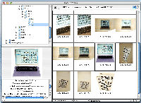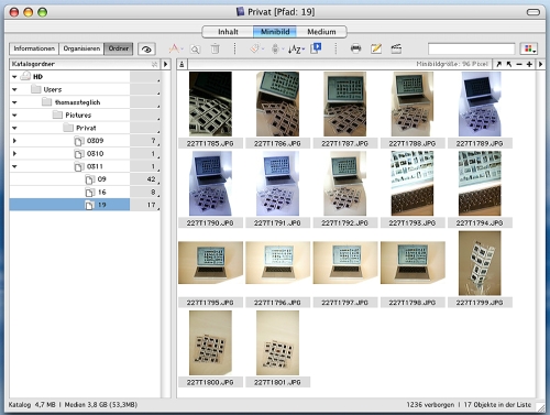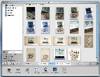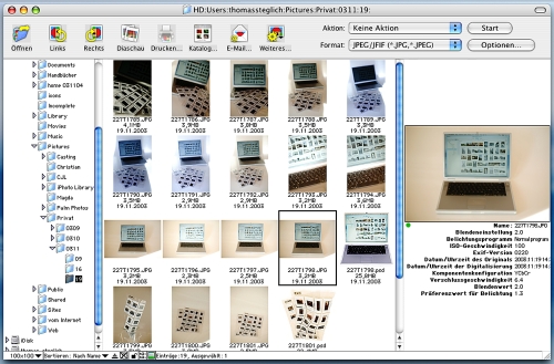 Der GraphicConverter liegt hier in der Version 4.9 vor, wobei es sein kann, dass, da das Programm ständig weiterentwickelt und verfeinert wird, bei Erscheinen des Artikels schon bereits eine neuere Version zu bekommen sein wird. Die ständigen Arbeiten von Thorsten Lemke an seinem Programm haben es mit der Zeit zu einem sehr ausgereiften System zur Organisation und Nachbearbeitung von Bildern werden lassen, das bei vielen schon zu einem Standard Programm neben Photoshop geworden ist. Anders als iPhoto verwaltet der GraphicConverter die Bilder nicht in einer Datenbank, sondern per Vorschau in Form eines Dateibrowsers. Das Programm ist sehr komfortabel und die Kontextmenüs sind sehr ausgefeilt. Zur Auslagerung der Bilddaten auf externe Medien übergibt der GraphicConverter die Layoutdaten an Toast oder iDVD. Die Bilder können im Browser in verschiedenen Größenstufen angezeigt werden. Praktisch ist auch, dass dort eine vergrößerte Vorschau von ein oder auch zwei Bildern gleichzeitig möglich ist. Das Sortieren ist entweder per Etiketten oder per drag and drop, also verschieben oder kopieren innerhalb des Programms möglich. Letzteres funktioniert auch für die Übergabe der Dateien an andere Programme, allerdings nicht an den Finder.