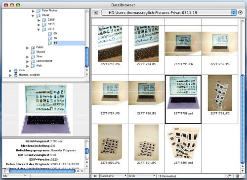 In der Thumbnailansicht des Dateibrowsers kann die Größe der Thumbnails in 3 Stufen eingestellt werden, wobei aber nur die beiden größeren brauchbar sind. Zusätzlich wird das momentan ausgewählte Bild in einem Vorschaufenster größer angezeigt. Die Motive können durch drag and drop auf die Ordnerleiste oder durch die Vergabe von Rangbuchstaben sortiert werden. Eine Auslagerung der Dateien auf externe Medien kann ebenso nur über dieses drag and drop auf andere Programme erfolgen.