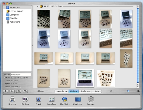 Zum Sortieren kann man die Bilder in sogenannte Alben ablegen, wobei dort nur Aliase untergebracht werden und die Originale geordnet nach "Filmen", je ein Import ergibt einen Film, verbleiben in der Bibliothek. Innerhalb der Alben kann die Reihenfolge der Bilder durch einfaches drag and drop verändert werden. Mit dem gleichen Verfahren könne die Bilder auch nach ausserhalb des Programms kopiert werden. Das Verschieben funktioniert nur innerhalb der Datenbank. Die Bilder können in der Ansicht auch gedreht werden und das auch im Stapelverfahren, aber die Originalbilder werden dabei nicht angetastet. Das Verändern der Dateinamen ist möglich, aber nicht im Stapel. Ebenso wenig wird eine programminterne IPTC Beschriftung unterstützt. Denkbar ist hier aber, da iPhoto Appleskript fähig ist, eine Zusammenarbeit mit anderen Programmen. Die Exif Daten jeder Aufnahme können angezeigt werden und eine sehr komfortable Diaschau ist möglich, wobei für die musikalische Untermalung auf die Datenbank von iTunes zurückgegriffen werden kann. Allerdings das Organisieren der Bilder während der Präsentation ist nicht möglich. Dafür kann man mit iPhoto sehr schöne Indexprints oder Kontaktbögen anfertigen und auch der Mehrfachausdruck eines oder mehrerer Bilder in unterschiedlichen Formaten wird unterstützt. Ursprünglich war von Apple auch die Implementierung eines Online Bilderdienstes geplant, aber in diesen Genuss kommen momentan noch nur die Nutzer in den USA.